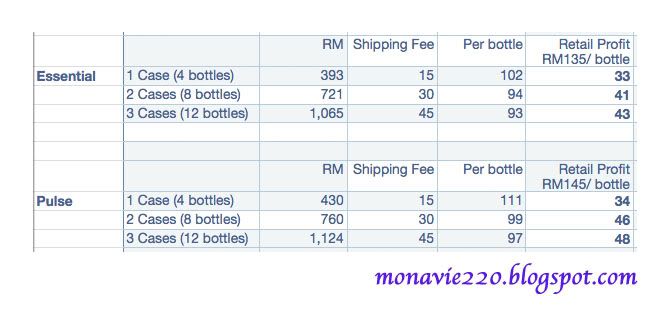 Example above shows the retail profit you may earn (per bottle) if follow the retail price of RM135 (Monavie Essential) and RM145 (Monavie Pulse) recommended by Monavie Malaysia.